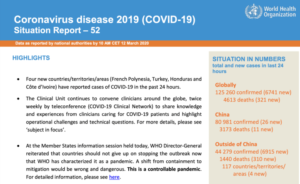 Numărul de cazuri confirmate în afara Chinei (6,4 miliarde de oameni) a fost de 44.279, dintre care 1.440 de decese (cifre înregistrate de OMS pentru 11 și 12 martie).