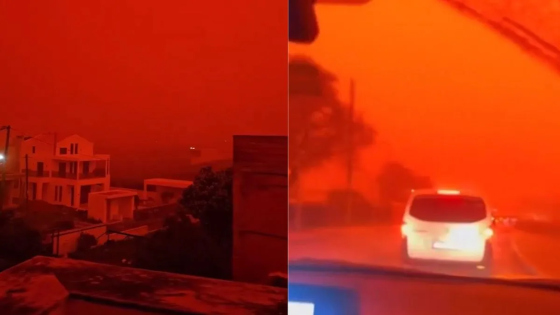 Insula greacă Creta a fost cuprinsă de o furtună sufocantă de praf saharian, în timp ce vânturile puternice au traversat regiunea. Cerul a fost vopsit astfel într-o nuanță roșu-portocalie stranie, asemănătoare cu un mediu de pe Planeta Marte.