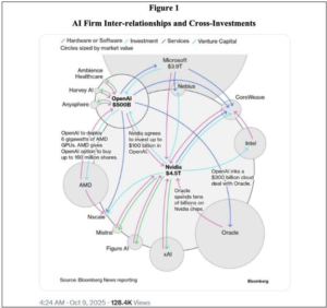 În fine, a treia problemă este circularitatea financiară, care aduce aminte de bula dot com; iată o schiță a complexelor relații și aranjamente din sânul industriei, cu Nvidia în centru, ca principal motor al bulei IA: