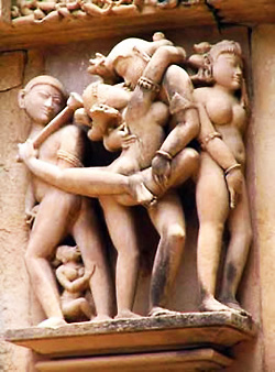 MPF: Evident, faptul că se pot vedea reprezentările cele mai fizice ale iubirii. La Khajuraho, există un basorelief mare care ar putea fi – pentru a folosi un termen vulgar – un fel de „amor în grup”… Pentru cel care nu cunoaşte hinduismul, acestea ar putea fi nimic altceva decât o lungă bandă sculptată, un fel de „benzi desenate”, care descriu diverse posturi erotice. Unele cunoscute, cel puţin sper, altele mai puţin, pentru că sunt mai dificile şi chiar foarte acrobatice, cerând o supleţe a corpului care nu ne este obişnuită nouă, căci noi suntem duri, băţoşi, pe când hindusul are o supleţe atât de mare încât poate dormi în orice colţ, putând să adopte orice fel de atitudine. Oricum, aceste poziţii sunt adesea atât de complexe încât este necesar ca cei doi iubiţi să fie ajutaţi de nişte asistenţi care să îi menţină suspendaţi în aer, beneficiind astfel de o „levitaţie artificială” care să le permită să realizeze aceste posturi neobişnuite, chiar periculoase pentru cei rigizi. Noi, occidentalii, cu greu am risca să ne aventurăm astfel, ca nu cumva să ne rupem vreun membru!
