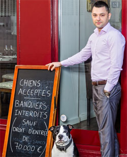 Alexandre Callet, în vârstă de 30 de ani, care deţine un restaurant în Hauts-de-Seine în regiunea Parisului, a postat în faţa uşii restaurantului lui un anunţ în care a scris: „Accept animale, dar intrarea e interzisă bancherilor, cu excepţia cazului în care plătesc 70.000 de euro”, scrie Le Figaro.