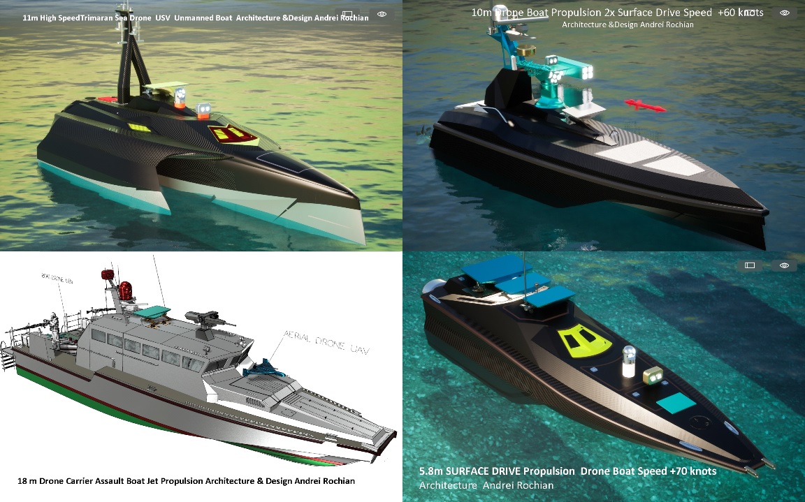 Succes cu aplauze și ovații din partea Forțelor Navale Române reprezentate de vice-amiralul Mihai Panait pentru o serie de ambarcațiuni-dronă de apărare prezentate la Cercul Militar Național din București, realizate ca arhitectură și design de românul Andrei Rochian: Primele ambarcațiuni drone (fără echipaj uman) concepute vreodată în mod special pentru România și pentru a fi fabricate în România au fost prezentate la Black Sea Defense & Aerospace 2024, la București, pe 22 mai 2024.