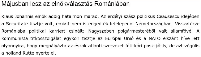 „În luna mai vor avea loc alegeri prezidențiale în România, până atunci președintele Klaus Johannis va rămâne la putere. Politicianul sas transilvănean a fost ofițer în Securitatea lui Ceaușescu și nu a fost lăsat să se stabilească în Germania. La întoarcerea în România a făcut carieră politică: fostul ofițer al serviciilor secrete comuniste a devenit un susținător convins al Uniunii Europene și al NATO, până la punctul de a candida pentru postul de secretar general al organizației nord-atlantice, care a fost câștigat în cele din urmă de olandezul Rutte.