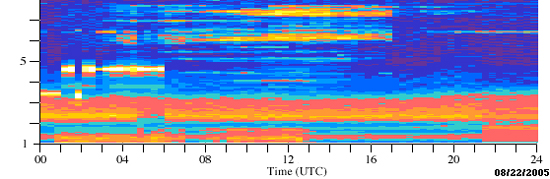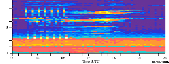 Unitatea HAARP a fost foarte activă în săptămânile dinaintea, din timpul şi la scurt timp după ce Katrina a devenit un uragan, dezvoltat din ceea ce inițial a fost catalogat drept o depresiune tropicală de gradul 12. Zonele colorate care seamănă cu nişte clape de pian sunt reprezentările vizuale ale activităţii HAARP în aria geografică în care Katrina a fost activ. Acesta este denumit un „grafic al căderii de apă”. Pe axa verticală avem frecvențele cuprinse între unu și 30 de megaherți.
