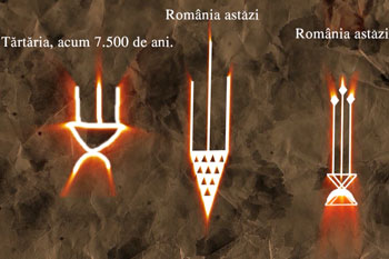 Să dăm doar exemplul conservării pe sute de case din Bucovina a unor simboluri solare care vin tocmai din cultura Turdaș-Vinca (cu o vechime de 7.500 de ani), de pe celebrele plăcuțe de la Tărtăria. Priviți acest simbol complex, incizat pe una dintre tăblițele de la Tărtăria și pe care îl găsim aproape identic, astăzi, pe casele tradiționale din Bucovina:
