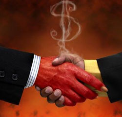 „Lumea în care trăim în prezent este una în care se aude zăngănit de arme mai mult ca niciodată. Corporatocraţia prosperă de pe urma unei economii care depinde de producţia de echipamente pentru armată. Companiile americane producătoare de armament se situează printre cele mai profitabile firme de pe glob. Combinate cu cele ale Marii Britanii, Franţei, Rusiei şi Braziliei, vânzările acestora se apropie anual de un total de 900 de miliarde de dolari. Arsenalurile de arme chimice, nucleare şi biologice din zilele noastre împreună cu cele mai tradiţionale sunt capabile să stimuleze economiile, deşi, în acelaşi timp, tot ele reprezintă o ameninţare de genocid. Consumul de armament a atins cote de dependenţă la nivel global: statutul politic al unei ţări se măsoară de multe ori prin prisma dimensiunii arsenalului de care dispune. Corporatocraţia a reuşit să asocieze afacerea de vânzare a morţii cu diplomaţia internaţională. Un exemplu: Israelul şi Egiptul primesc fiecare miliarde de dolari anual din partea Washingtonului de pe urma participării lor din anul 1978 la acordurile de pace de la Camp David. Ca parte a acestui acord de „pace”, lor urmează să le fie destinate o mare parte a fondurilor aprobate de Congres, în scopul achiziţionării de echipamente militare de la Statele Unite.”
