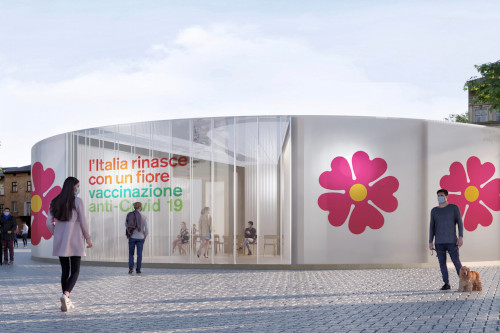 Potrivit sursei citate, designul pentru aceste pavilioane a fost creat de echipa arhitectului Stefano Boeri, cel căruia i-a fost încredințată misiunea de a crea un logo și o identitate vizuală pentru campania de vaccinare.