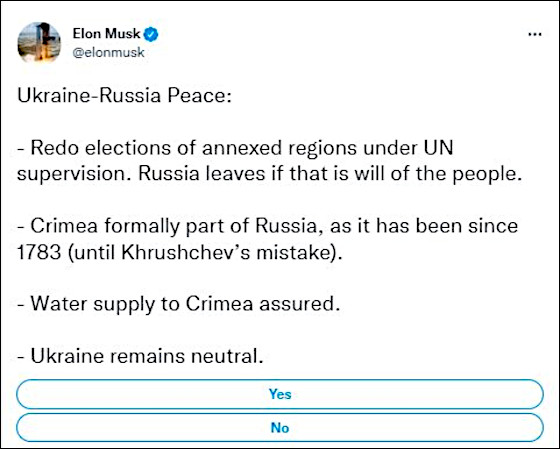 Musk a spus că „Rusia pleacă dacă aceasta este voința poporului”, sugerând și că lumea ar fi necesar să recunoască „formal” Crimeea – anexată de Moscova în 2014 – ca parte a Rusiei. În sfârșit, cel mai bogat om din lume a avertizat că acest conflict s-ar putea încheia într-un război nuclear, deși a adăugat că această evoluție este „puțin probabilă”.