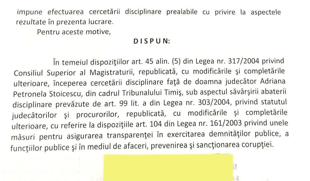 Judecătoarea Adriana Stoicescu de la Tribunalul Timiș, cunoscută în spațiul public pentru luările sale de poziție pe subiecte sensibile din justiția românească, a anunțat că a fost demarată cercetarea disciplinară împotriva sa. Ea a postat pe Facebook fotografia de mai jos, cu mențiunea: „Prezența mea în spațiul public se oprește acum și aici. Vă doresc dictatură plăcută!”. Până la ora publicării acestui articol, postarea a numărat aproape 900 de reacții și 141 comentarii.