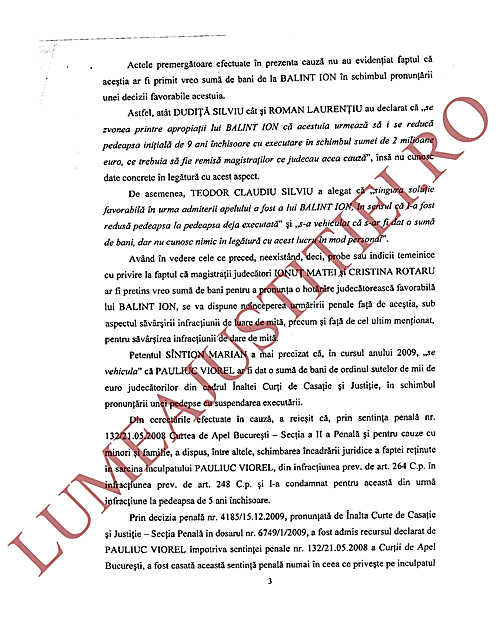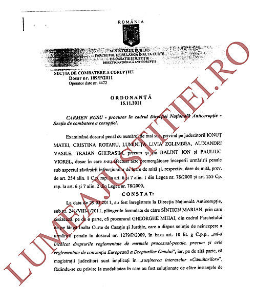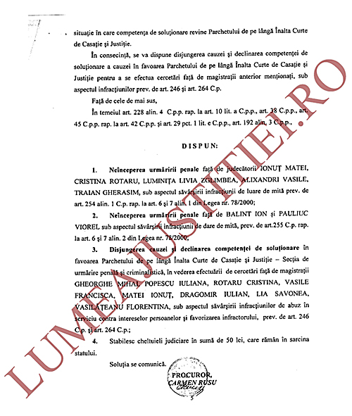 Cu toate acestea, ordonanța la care ne-am referit precizează că din actele premergătoare efectuate de procuroarea Carmen Rusu (din cadrul DNA) nu au reieșit suficiente indicii privind săvârșirea infracțiunii de luare de mită care a fost sesizată la DNA de procurorul Sintion, astfel că la data de 15 noiembrie 2011 s-a dispus neînceperea urmăririi penale (NUP) față de judecătorii ÎCCJ Ionuț Matei, Cristina Rotaru, Luminița Livia Zglimbea, Alixandri Vasile și Traian Gherasim, precum și disjungerea cauzei sub aspectul infracțiunilor de abuz în serviciu și favorizarea infractorului și declinarea competenței dosarului în favoarea Secției de urmărire penală a Parchetului Înaltei Curți de Casație și Justiție, față de magistrații Gheorghe Mihai, Iuliana Popescu, Cristina Rotaru, Francisca Vasile, Ionuț Matei, Iulian Dragomir, Lia Savonea și Florentina Vasilăteanu.