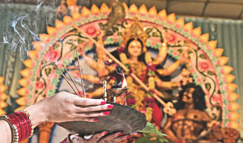 S-a înserat. Altarul este strălucitor şi foarte frumos decorat. Ghirlande de flori împodobesc reprezentarea zeităţii, în timp ce multe flori aşezate pe tăvi aşteaptă să fie oferite. Lămpile şi tămâia sunt aprinse. Adoratorii se aşază în faţa altarului, în genunchi şi se interiorizează pentru câteva minute înainte de a începe ceremonia. Acum este atât de linişte încât poţi auzi o pană căzând.