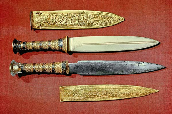 Quand, en 1925, Howard Carter découvre la momie de Toutankhamon dans son ultime sarcophage, il découvre deux dagues, dont une plaquée contre sa cuisse. C’est une magnifique arme d’apparat longue de 34,2 cm. Elle est constituée d’un manche en or ouvragé, surmonté d’un pommeau de cristal de roche. Mais ce qui stupéfie l’archéologue et tous ceux qui l’accompagnent, c’est la lame !