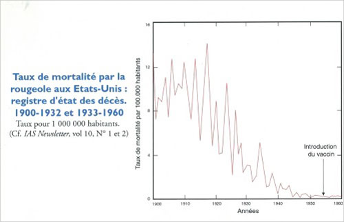 Aux États-Unis, en 1958, on répertoriait environ 800.000 cas de rougeole, mais en 1962, une année avant l’introduction du vaccin, ce chiffre était brusquement tombé à 3.000. Pendant les quatre années suivantes, ce chiffre a continué à baisser alors que les vaccins administrés pendant cette période furent jugés par la suite parfaitement inutiles au point d’être abandonnés. Cependant, les vaccinations ont repris de plus belle dès 1978 et, d’après le Dr Mendelsohn, « la mortalité par rougeole a été multipliée par 25 depuis ces campagnes vaccinales ».