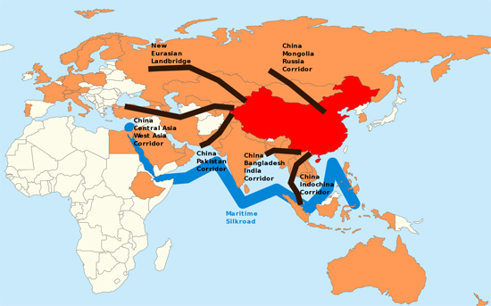 Pékin a réagi aux efforts visant à l’encercler stratégiquement en faisant progresser son projet « One Belt-One Road » (OBOR, la nouvelle route de la soie) pour les routes commerciales terrestres et maritimes à travers l’Eurasie, financé par la Banque asiatique d’investissement dans les infrastructures (AIIB).