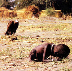 În 1994, fotografia din dreapta a câştigat premiul Pulitzer. Poate o ştiţi. A fost făcută în timpul foametei din Sudan şi reprezintă un copil, aproape mort de foame, târându-se spre o tabără de provizii aflată la un kilometru depărtare. Vulturul aşteaptă ca acel copil să moară ca să îl mănânce. Nimeni nu ştie ce s-a petrecut cu acel copil, nici măcar fotograful, Kevin Carter, care a plecat după ce a făcut fotografia.