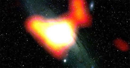 Lorsque ce faisceau pénètre dans la poussière et les gaz environnants, il agit comme un accélérateur de particules géant, brisant les particules ensemble et produisant une nouvelle matière à partir de l’énergie.