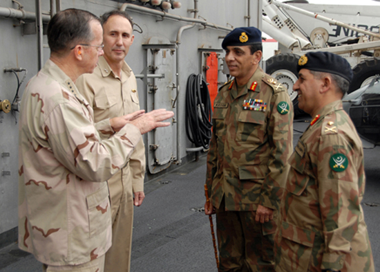 Lt. gén. Ahmed Shuja Pasha (à droite) aux côtés du gén. Ashfaq Kayani sur le USS Abraham Lincoln discutant avec Michael Mullen, chef d’État-major des armées.