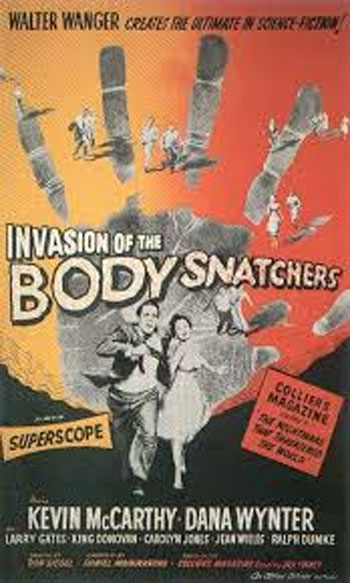 Le film The Invasion of the Body Snatchers (L’Invasion des profanateurs de sépultures, plus justement L’Invasion des voleurs de corps), réalisé par le réalisateur états-unien Donald Siegel (1912/1991), sort en 1956. Il est précurseur du thème du contrôle mental et de la prédation psychique par une technologie de nature psycho-somatique, ceci étant à l’époque hors du champ de conscience de la majeure partie de l’humanité. Les aliens (créatures extraterrestres) sont montrés prenant le contrôle du monde terrestre en occupant les corps d’êtres humains. Ils prennent le contrôle non seulement du corps physique mais aussi de l’esprit, de la mémoire, des facultés … Les gens possédés y sont montrés comme se comportant de manière identique de toutes les façons possibles. Et s’ils mentionnent des évènements spécifiques à leur vie, ils n’éprouvent plus aucun sentiment à leur propos. Ils ne ressentent rien.