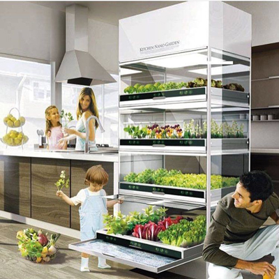 Fonctionnant selon le même principe, citons aussi le Kitchen Nano Garden produit par Hyundai, une serre hydroponique d’intérieur, dont les dimensions sont celles d’un grand réfrigérateur, ou encore le Urban Cultivator.