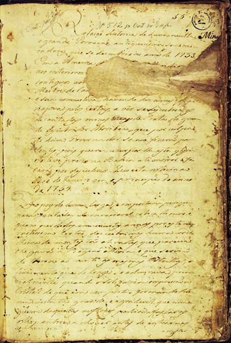 « En Amérique ………… nos intérieurs (à l’intérieur des terres) …… Aos contigu (à côté de la) … .Mestre de Can (Maître de Can) ……………………… ..et son groupe (commitiva), ayant voyagé pendant dix ans dans les sauvages (sertoes) pour voir si nous pourrions localiser les fameuses mines d’argent de la Grande Moribecca qui, par le blâme (culpa) d’un gouverneur, n’a pas obtenu de lettres patentes, parce que le gouverneur voulait prendre les mines d’argent pour lui-même et la gloire de celui-ci, et lui, le Moribecca, a été gardé prisonnier à Bahia, jusqu’à sa mort, ce qui a été fait pour vider hors de lui l’emplacement des mines d’argent. le début de l’année 1754…
