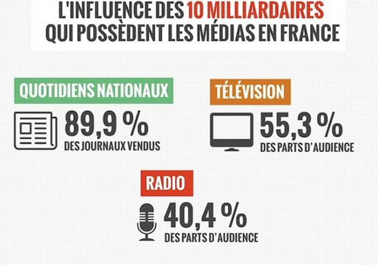 Ils sont cinq à faire partie du cercle des dix premières fortunes de France : Bernard Arnault, PDG du groupe de luxe LVMH (patron des Echos, du Parisien), Serge Dassault (Le Figaro), François Pinault (Le Point), Patrick Drahi, principal actionnaire de SFR (Libération, L’Express, BFM-TV, RMC), Vincent Bolloré (Canal+). On trouve ensuite Xavier Niel, patron de l’opérateur de téléphonie Free et 11ème fortune de France, qui s’est associé avec Pierre Bergé, héritier du couturier Yves Saint-Laurent, et avec le banquier Matthieu Pigasse, pour devenir propriétaire du groupe Le Monde (L’Obs, Télérama, La Vie…). Matthieu Pigasse possède également Radio Nova et l’hebdomadaire Les Inrocks.