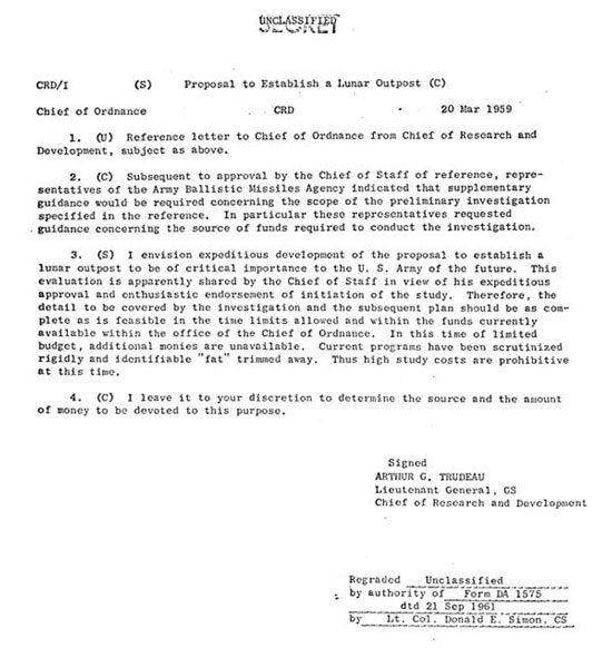 « Être en second lieu l’Union Soviétique en établissant un avant-poste sur la Lune serait désastreuse pour le prestige de notre nation et à son tour à notre philosophie démocratique. Bien qu’elle soit contraire à la politique des Etats-Unis, l’Union Soviétique, en établissant la première base permanente, peut revendiquer la Lune ou des zones critiques sur elle-même. »