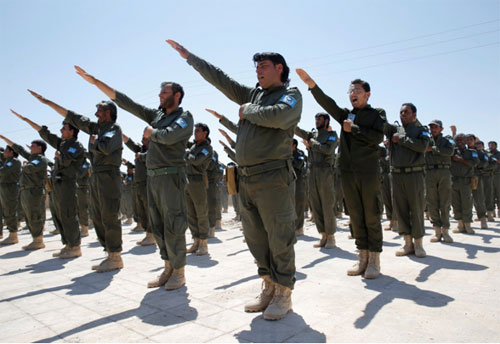 Miliciens majoritairement kurdes, formés par les Etats-Unis pour prendre le contrôle de Rakka, prêtant un serment collectif, le 17 juin 2017.