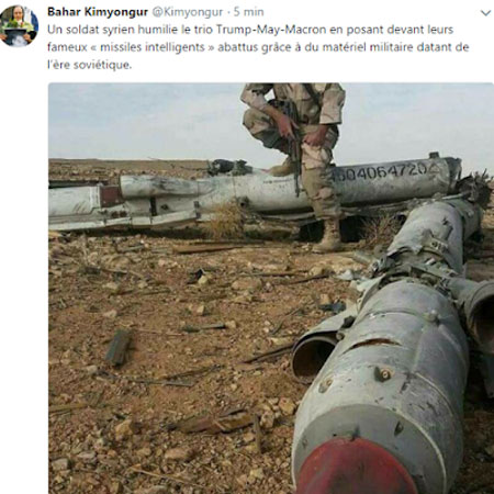Et pour ceux qui ont des doutes quant à la véracité de la destruction des « missiles démocratiques et salvateurs », dont les médias occidentaux ne disent un mot, les réseaux sociaux commencent à sortir des photos, mais qui elles étrangement ne sont pas reprises par les journalistes, tant avides de justice :