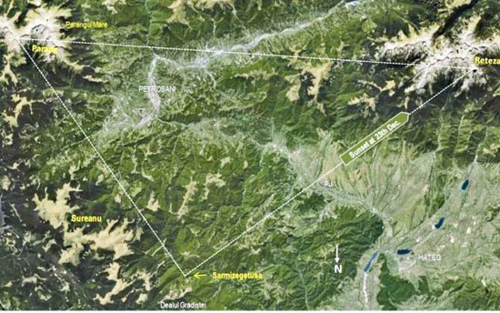 Sarmizegetusa se află la vârful unghiului drept al unui mega triunghi format cu două vârfuri proeminente ale munților Retezat şi Parâng, o ipoteză confirmată în detaliu de date precise obținute prin satelit şi GPS. Iarna, dealul Sarmizegetusei este la apus aliniat spre Retezat şi acest eveniment ceresc poate fi observat din acest loc. Recenta descoperire a brăţărilor masive de aur din Sarmizegetusa susţine, de asemenea, acest statut al său, de destinaţie sacră-ceremonială. Am identificat două drepte dimensionate exact pe vârfurile mega-triunghiului, probabil construite de astronomii daci pentru a spori prin triangulare precizia măsurătorilor unghiului azimutului. Marginea de 160 de metri a piramidei trunchiate a Retezatului a fost, probabil, aranjată prin netezirea, de către oameni, a vârfului. Traseele de construcţii similare pot fi identificate în jurul vârfurilor Piatra Tăiată şi Coasta lui Rus, din Munţii Parâng”, susţine cercetătorul, în rezumatul celor şase pagini ale studiului.