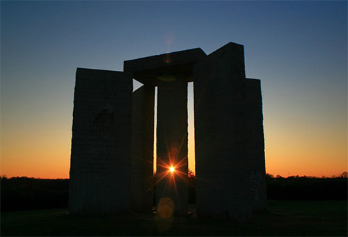 Dar detaliul cel mai uimitor al monumentului nu este dimensiunea lui, ci ceea ce e gravat pe el: Zece reguli pentru o „epocă a rațiunii”. Aceste reguli sunt asociate cu Noua Ordine Mondială, depopularea masivă a planetei, un guvern mondial unic, introducerea unui nou tip de spiritualitate etc.