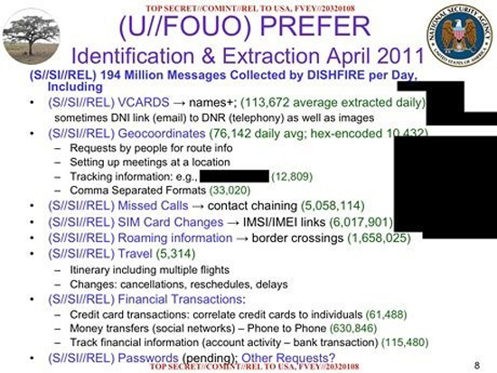 L’agence a mis en place un programme automatique de copie des SMS envoyés dans le monde sous le nom de code Dishfire. Il intercepte jusqu’à 200 millions de messages chaque jour et la NSA précise que « c’est une véritable mine d’or à exploiter » pour en extraire toutes sortes d’informations personnelles sur les individus.