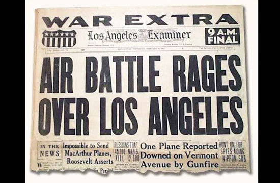 12h30 du soir, les canons antiaériens ont commencé à tirer. Ce dont nous parlons, c’est de cette situation fantastique, l’événement de Los Angeles – la bataille de Los Angeles, d’accord ?