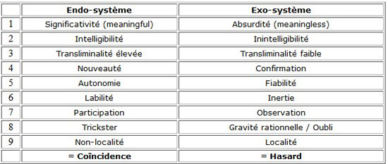 A la fin de son livre, Joachim Soulières dresse un tableau de synthèse qui décrit l’ensemble des propriétés qui caractérisent les coïncidences en les divisant en fonction de la perspective selon laquelle on les considère (en 1ère personne: endo-perspective, en 3ème personne : exo-perspective). Comprenez l’endo-système comme un système d’évaluation subjective (en 1ème personne) alors que l’exo-système est le système habituel d’évaluation objective (en 3ème personne) qui, en l’absence d’enchainement de causes à effets, exclut le premier en partant du principe que dans ce cas la réalité extérieure doit rester nécessairement indépendante de notre psyché.