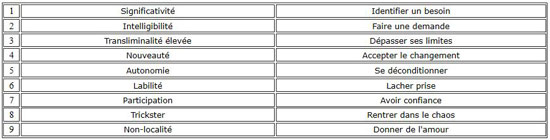 On a donc 9 mots d’un côté et 9 phrases de l’autre pour parler des facteurs favorables à l’apparition des synchronicités. On remarque quelques correspondances évidentes comme « Libre arbitre et Autonomie », « Nouveauté et Changement », « Labilité et Détachement »…. Ces deux classifications ayant été établies dans un contexte totalement différent, on pourrait s’attendre à ce que la correspondance s’arrête là, or on découvre au contraire un mariage parfait entre les listes de Joachim Soulières et de Philippe Guillemant :