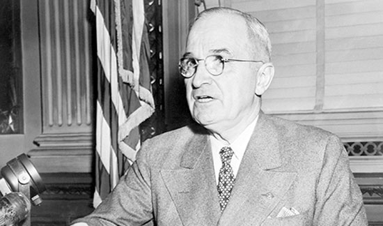 Harry Truman s’adresse aux médias en 1945 à Washington, D.C.