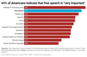 Un nou sondaj FIRE/NORC arată că doi din trei americani consideră libertatea de exprimare ca fiind foarte importantă pentru votul lor în 2024, pe locul doi după inflație.