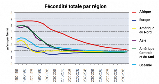 Les projections démographiques sont celles de la Division de la population des Nations unies. Elles indiquent un recul permanent du taux de croissance démographique sur la quasi-totalité de la planète. Néanmoins, une différence frappante persiste entre les pays capitalistes avancés et l’Afrique. Avec un taux de 0,33 % par an, il faudrait 210 ans pour doubler la population des premiers, alors que 32 ans suffiraient pour y parvenir en Afrique.