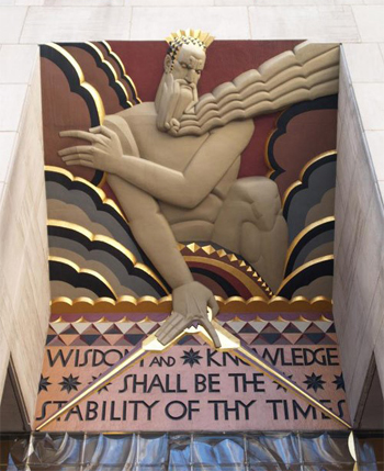 Pe partea de sus a intrării în clădirea GE se află o frescă Art Deco, înfăţişând un bărbat cu barbă care ține un compas foarte mare, și un citat din Cartea lui Isaia. Compasul şi echerul sunt simboluri francmasonice binecunoscute, atribuite Marelui Arhitect al Universului, zeitatea care în cadrul acestei secte satanice ţine loc de Dumnezeu.