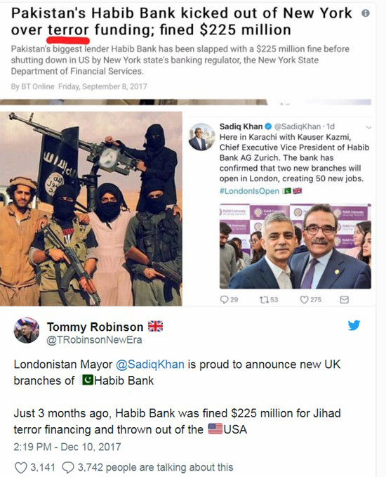 Khan, known for his sympathy to terror groups such as ISIS, claims Habib Bank’s track record of financing Islamic terrorism does not pose a moral problem for London.