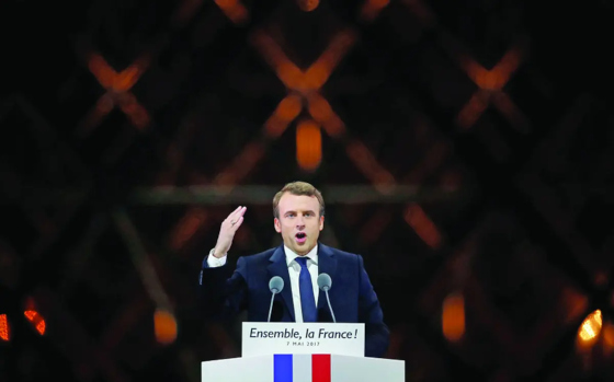Mai 2017: într-o ceremonie atent coregrafiată pentru a marca preluarea puterii, liderul nou ales ține un discurs triumfal în Curtea Napoleon din Muzeul Luvru.