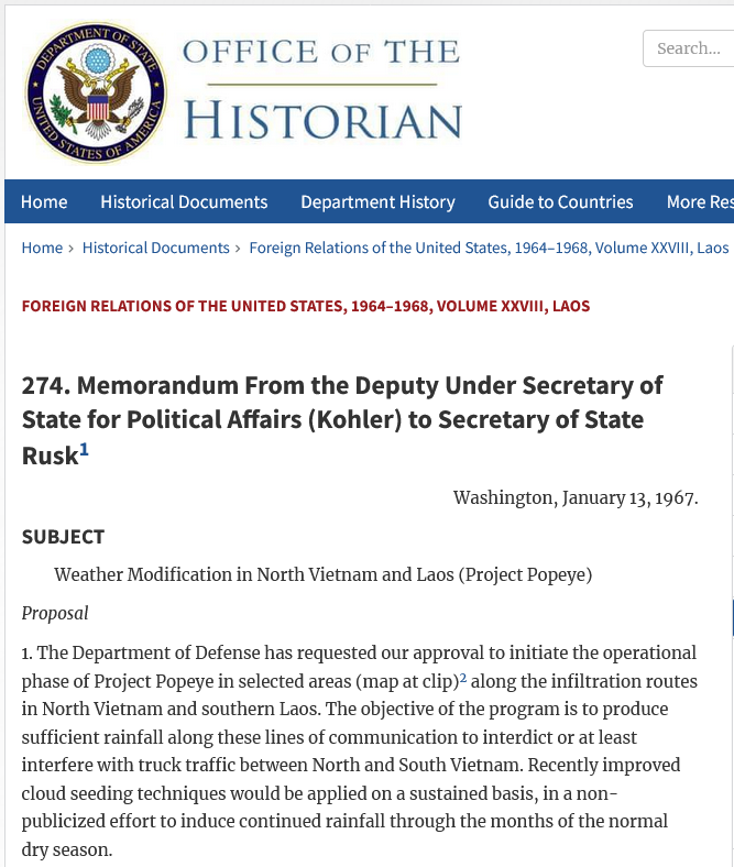 De exemplu, Operațiunea Popeye a Departamentului de Apărare al SUA în timpul războiului din Vietnam a aplicat cu succes metoda însămânțării norilor pentru a prelungi sezoanele musonice, iar eforturile uriașe ale Chinei de modificare a vremii au fost documentate public, existând planuri de a controla jumătate din vremea țării până în 2025.