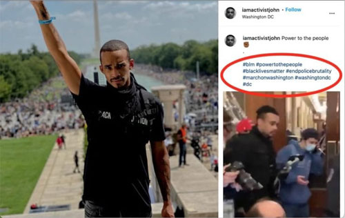 Aflat la fața locului, și Jack Posobiec (fost ofițer de informații la Office of Naval Intelligence – ONI), fost analist al Camerei de Comerț al SUA în Sanghai, fost corespondent al OAN și Rebel News Network, mai bine cunoscut pentru dezvăluirile făcute în celebrul caz „Pizzagate”, relatează despre persoane în haine negre care incită mulțimea la violențe.