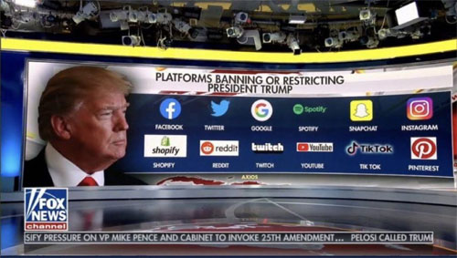 Michelle Obama a cerut ca Big Tech să îl blocheze definitiv pe Trump și ei s-au conformat. Twitter îl suspendă definitiv pe Michael Flynn, Sidney Powell, Reddit interzice forumul r / DonaldTrump, interdicția nedeterminată a Facebook asupra lui Trump a urmat deciziile luate de acesta, Twitter și YouTube, Snapchat l-au suspendat pe Trump pe termen nelimitat, iar Shopify a eliminat magazinele conduse de organizația Trump. Campania TrumpTwitter a fost vârful de lance a ceea ce s-a numit „The Purge”, suprimând în jur de 100.000 de conturi ale celor cu vederi de dreapta, printre aceștia aflându-se și președintele în exercițiu al Statelor Unite, avocați ai acestuia, congresmeni republicani, publiciști, practic oricine cu vederi apropiate de Trump.
