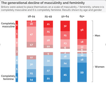 Între 18 și 24 de ani, doar 2% dintre tineri se simt „complet masculini” și doar 14% dintre tinere se simt „complet feminine”. Alterarea percepției tinerilor în ceea ce privește masculinitatea și feminitatea lor se datorează intensei educații progresiste ce a avut loc în ultimii 25 de ani, aceasta chiar agresivă în ultimii 15 ani.