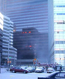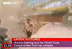 Imagine a WTC7 cu câteva ore înainte de prăbuşirea turnurilor gemene. Sunt vizibile incendii mari, izbucnite în clădire la etajele marcate pe fotografie, precum şi nori de fum ieşind din aceasta. Teroriştii încă nu îşi făcuseră apariţia… Cine să fi fost, oare, făptaşii? Sub acest pretext cusut cu aţă albă, administraţia americană a declanşat, fără să dea socoteală nimănui, cu o grabă suspectă, aşa-numitul război contra terorismului, prin care a urmărit să justifice inumanele intervenţii militare din Afganistan şi Irak. Aceste adevărate invazii erau, de fapt, de mult timp plănuite.  WTC7 s-a prăbuşit la ora 17:20, ora New York-ului, ceea ce corespunde cu 22:20, ora Londrei. Şocant, dar ştirile de la BBC au anunţat încă de la ora 21:54 că WTC7 s-a prăbuşit, deci CU 26 DE MINUTE ÎNAINTE DE A SE PETRECE EVENIMENTUL! Ulterior, când postului TV BBC i s-a cerut să confirme faptul, oficialii săi s-au eschivat, motivând în mod penibil că s-a pierdut caseta cu ştirea… Totuşi, evenimentul a fost înregistrat de alţii. Vedeţi în imaginea de mai sus o captură de ecran în care este evidenţiată, în stânga jos, ora la care a fost difuzată ştirea.