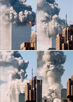 Serie de patru fotografii ilustrând prăbuşirea turnului sudic, WTC 1. Instantaneele au fost făcute de la aproximativ 1,5 km nord-est.