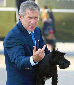 Chiar dacă poate părea greu de crezut că agenţii federali iniţiază acţiuni deosebit de violente şi de grave împotriva cetăţenilor americani, există sute de dovezi care demonstrează aceasta. În ceea ce priveşte evenimentele din 11 septembrie 2001, analizaţi singuri lista de fapte obiective pe care vi le prezentăm, care este de mare ajutor pentru a trage concluzii juste în legătură cu ceea ce s-a petrecut în realitate. Un şocant gest obscen din partea Preşedintelui unei ţări care se pretinde „stindardul democraţiei“. G. Bush îşi arată, o dată în plus, adevărata faţă anticristică.