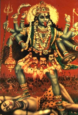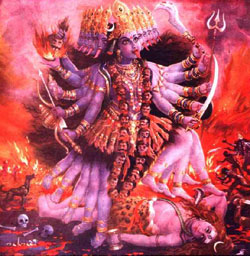“Mama Divină se joacă în multe feluri diferite şi se manifestă în nenumărate ipostaze. Ea este cea care este cunoscută ca Maha-KALI, Nitya-KALI, Shmashana-KALI, Raksha-KALI şi Shyama-KALI. Shyama-KALI are un aspect oarecum mai tandru şi este adorată zi de zi în casele indiene. Ea este cea care îşi revarsă bunătatea şi îndepărtrează frica. Oamenii o adoră pe Raksha-KALI, Protectoarea, pe timp de epidemie, foamete, cutremure, secetă şi inundaţii. Shmashana-KALI este teribilă, fiind întruchiparea puterii de distrugere.”