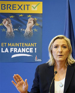 Liderul extremei drepte franceze, Marine Le Pen, şi-a lansat pe 4 februarie campania electorală pentru prezidenţiale cu un program de guvernare ce conţine renunţarea la moneda euro şi un referendum cu privire la ieşirea din Uniunea Europeană.