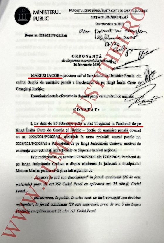 „La data de 25 februarie 2025 a fost înregistrat la Parchetul de pe lângă Înalta Curte de Casaţie şi Justiţie – Secţia de urmărire penală dosarul cu nr. 2226/221/P/2023/d1 constituit în urma preluării cauzei penale nr. 2226/221/P/2023/d1 a Parchetului de pe lângă Judecătoria Craiova, motivat de existenţa unor activităţi infracţionale cu dispersie la nivel naţional.